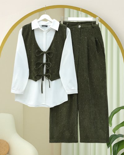 Önü Bağlamalı Yelek Pantolon Kadife Takım Haki