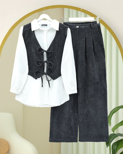 Önü Bağlamalı Yelek Pantolon Kadife Takım Antrasit