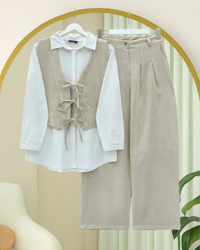 Önü Bağlamalı Yelek Pantolon Kadife Takım Bej