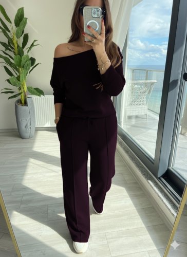 Kadın uzun kollu tek omuzdan açık modal bluz ve pantolon ikili mürdüm takım