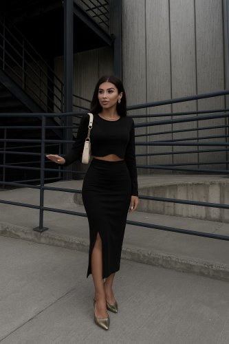 Kadın uzun kollu bisiklet yaka kısa krop dalgıç bluz ile önden yırtmaçlı uzun etek ikili takım