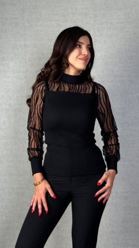 Kadın uzun kollu bisiklet yaka kolları tül detay kaşkorse kumaş bluz