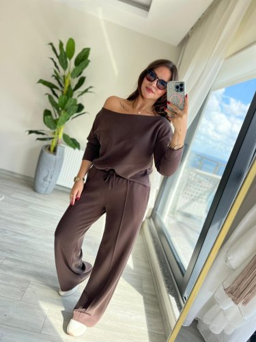 • Kadın uzun kollu tek omuzdan açık modal bluz ve pantolon ikili takım