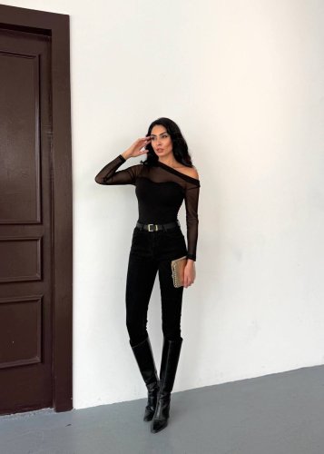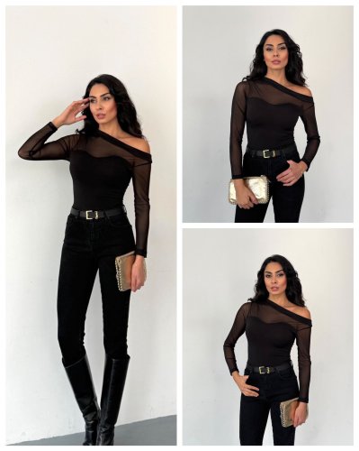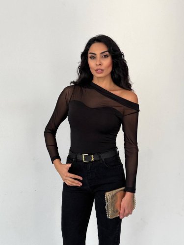 • Kadın uzun kollu omuz dekoltesi ve transparan tül detay bluz
