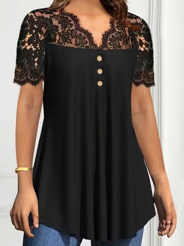Kadın kısa kollu v dantel yakalı düğmeli viskon bluz